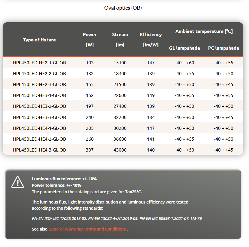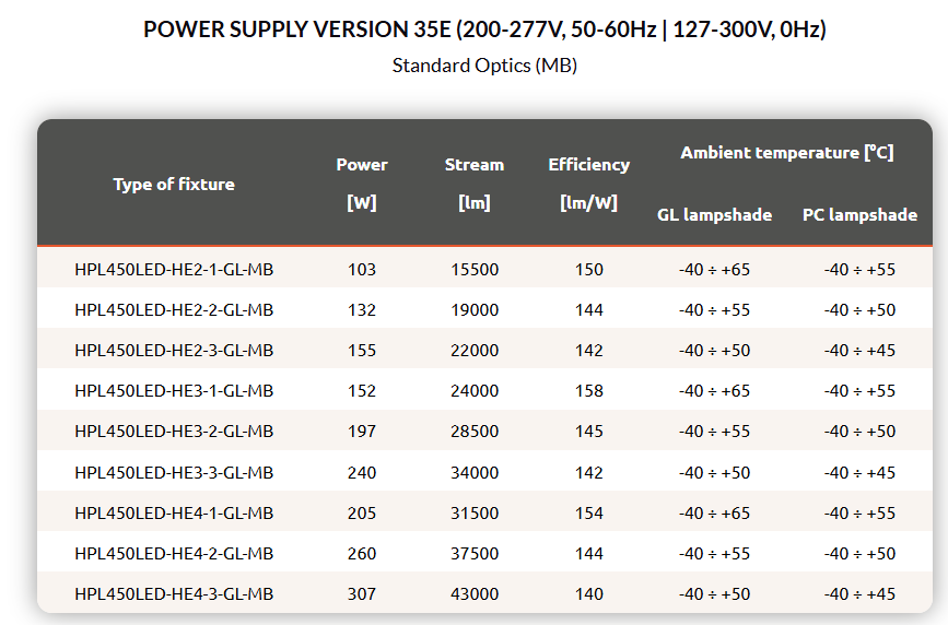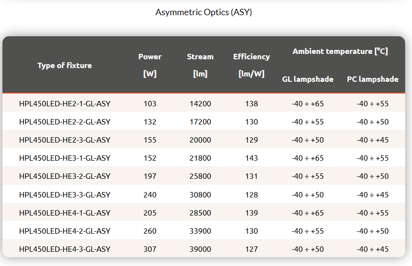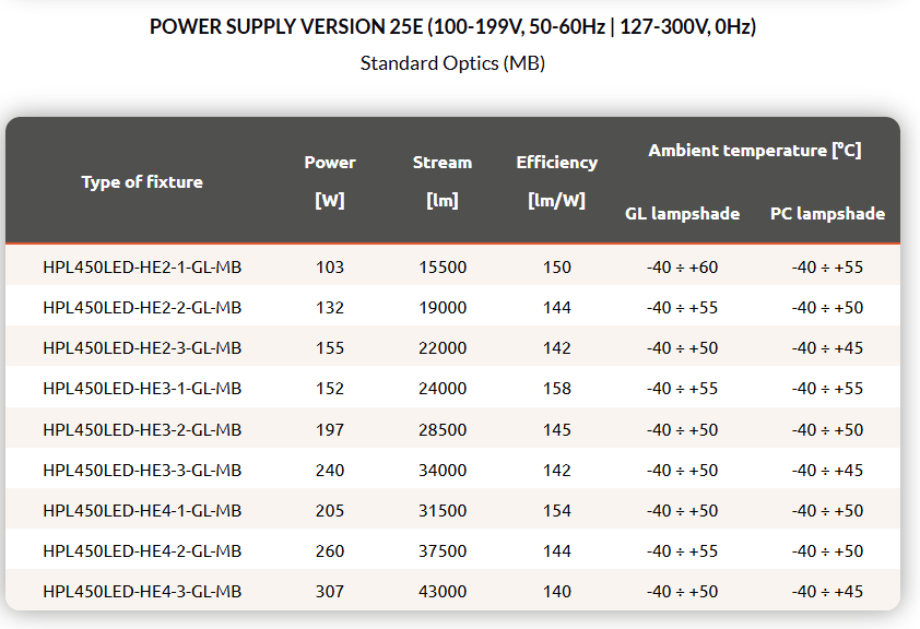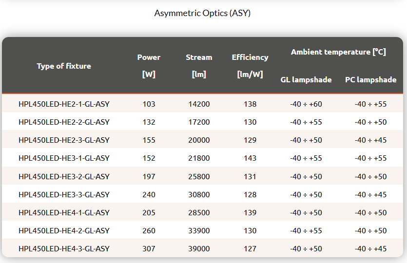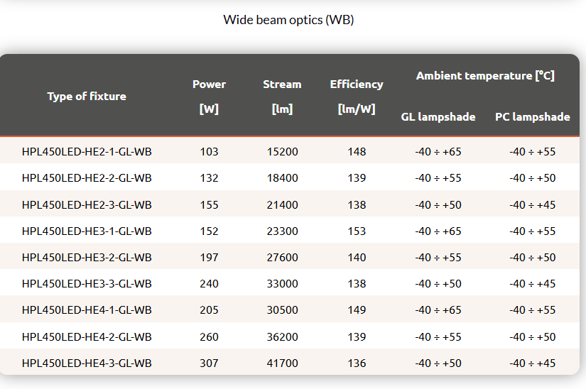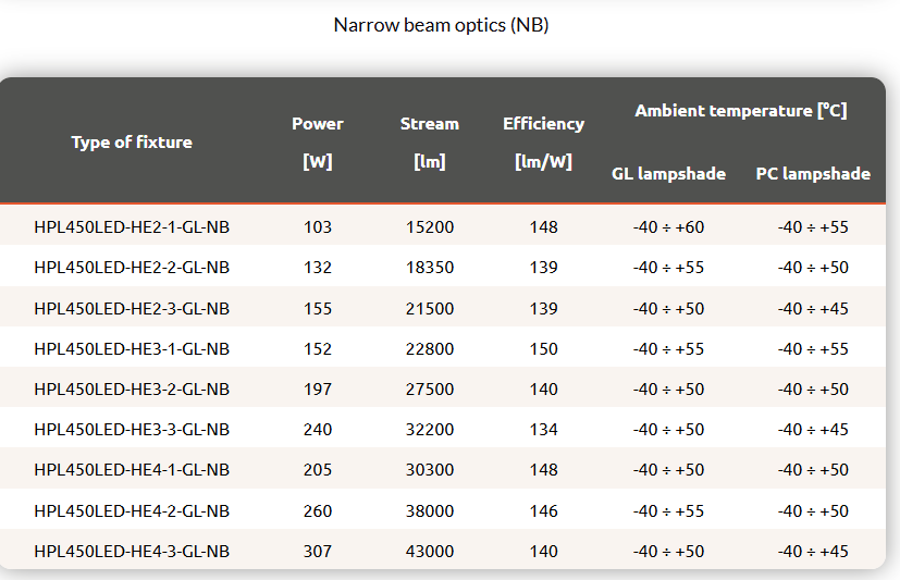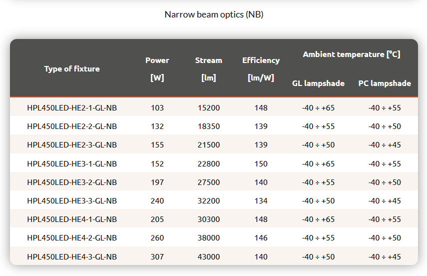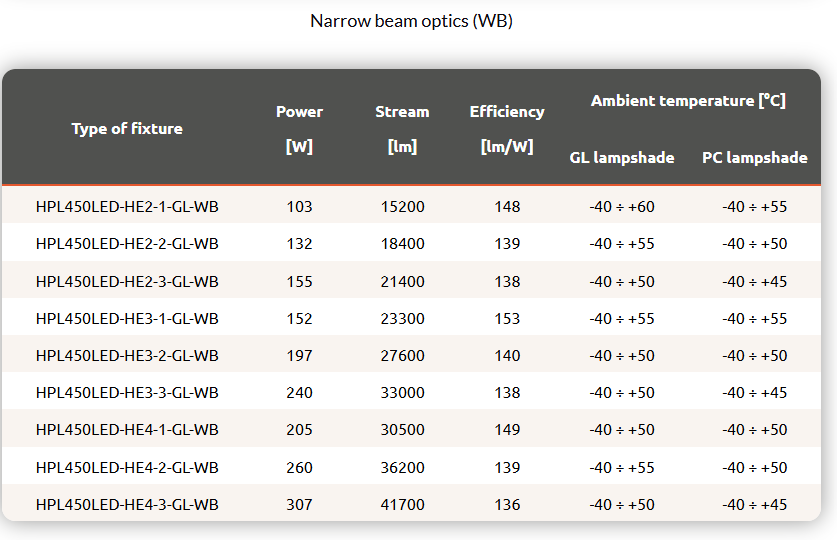 Industrial spotlight with high lumen output LED modules, with a choice of five available optics. The luminaire body is made of anodized aluminium, the optical housing is made of tempered glass (GL) or polycarbonate (PC).