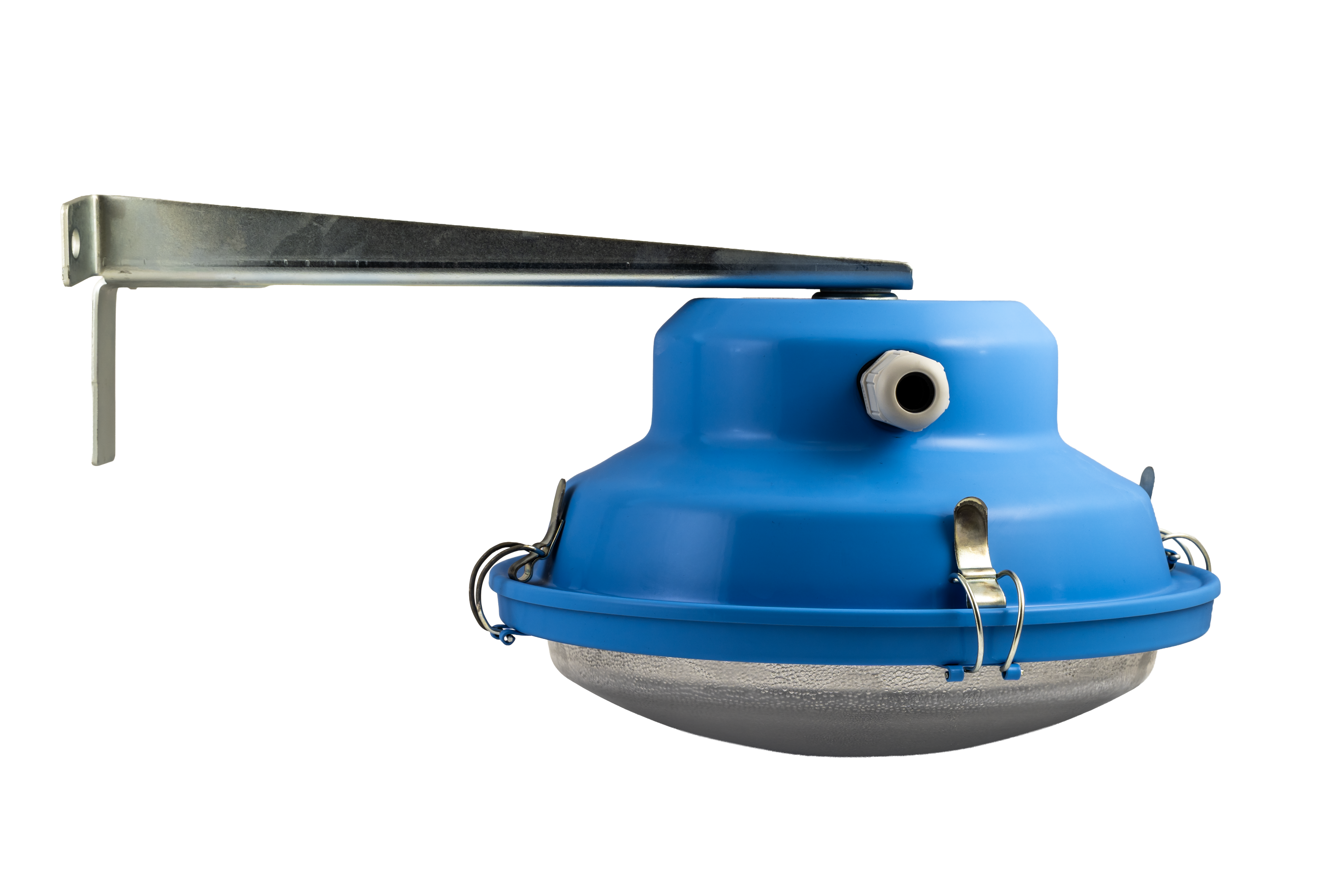 The inorganic glass cover with seal and protective basket are fixed to the body with four metal caps. There is a LED module built inside the light fitting and it is comprised of a board fitted with LEDs and a power supply. According to the individual types, the light fitting includes: an AlSi terminal box, a steel pipe, or a galvanized steel sheet boom. The light fitting is made as a through light fitting and is provided with two cable outlets.