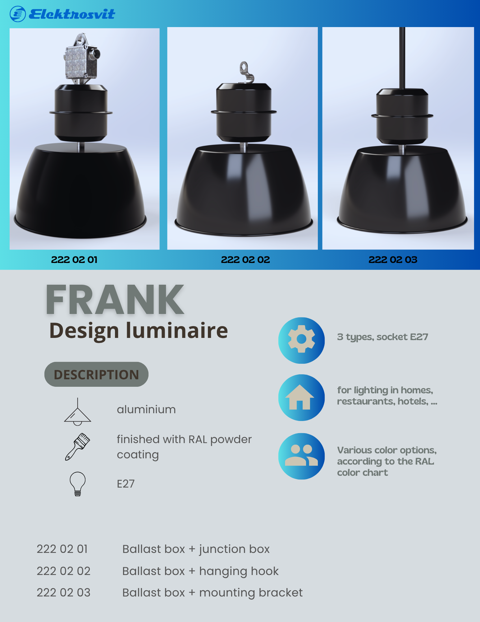 The lampshade is made of aluminum. The light fixture has an E27 socket. Color options are available according to the RAL color chart.